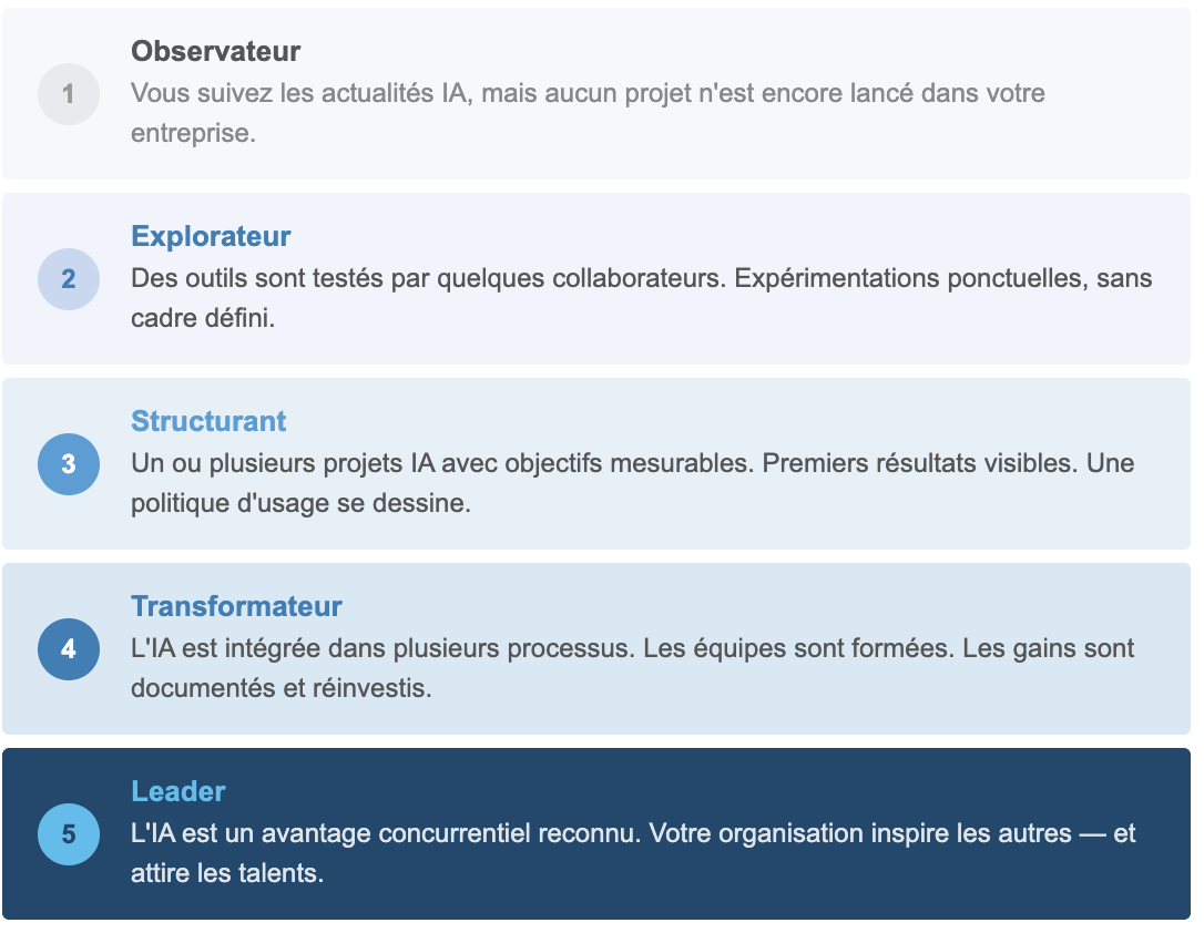 La plupart des PME françaises sont entre les niveaux 1 et 3. Notre auto-diagnostic vous positionne en 5 minutes — avec des recommandations concrètes pour passer au niveau suivant.